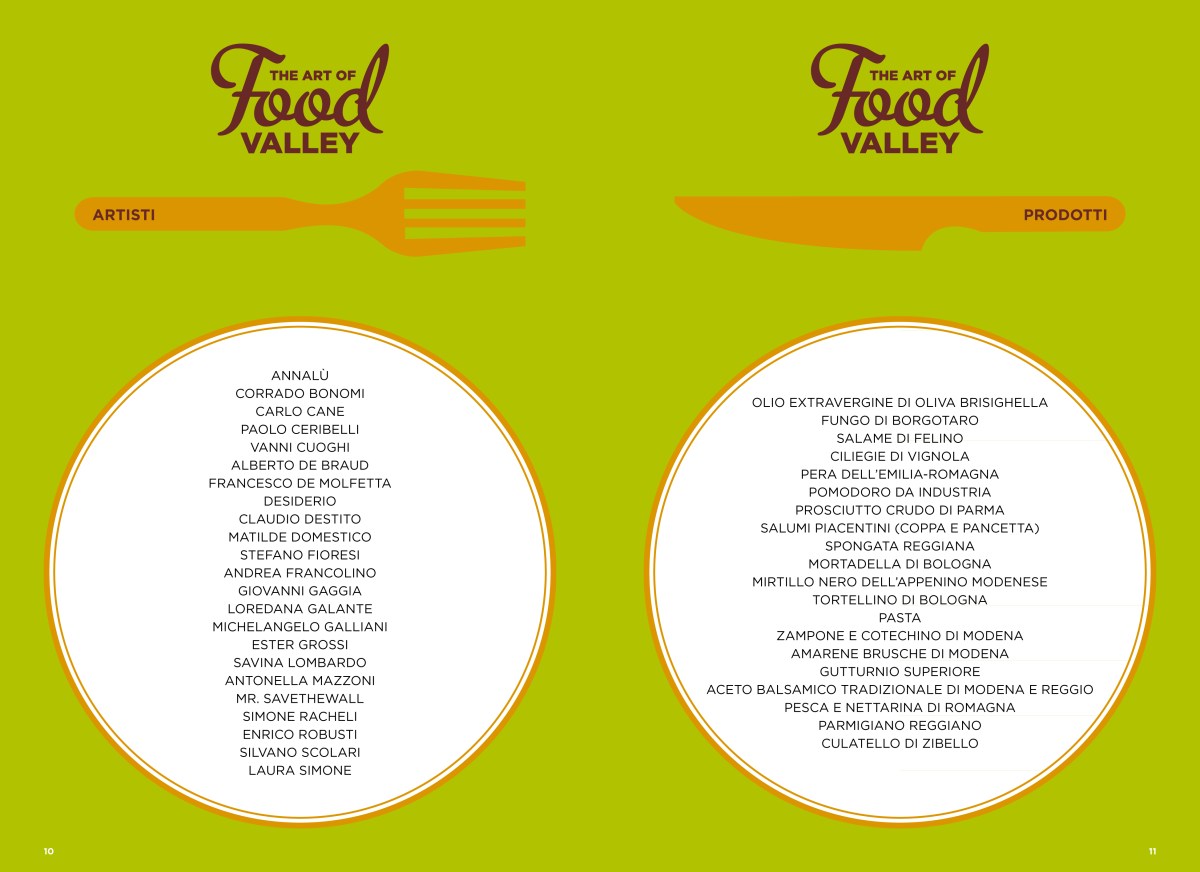 Ventiquattro artisti riflettono su venti prodotti tipici DOP e IGP compresi nel territorio della Food Valley, attraverso metodi, strumenti e linguaggi artistici che ne portano alla luce significati e valori legati alla sfera dell’estetica, del gusto, della cultura.